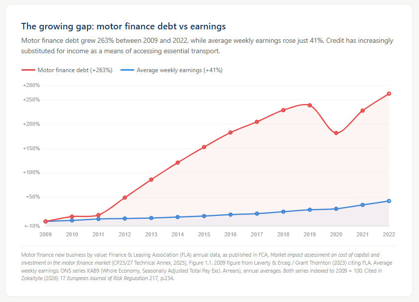 Motor finance debt in the UK grew from £11.2 billion in 2009 to £40.7 billion in 2022 – a 263% increase – while average earnings rose by just 41% over the same period.13 When credit grows that much faster than incomes, and when the products themselves are complex and commission-laden, the conditions for widespread consumer harm are firmly established.